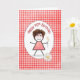 Niedliches Peitschmädchen mit Haaren, roten Brillen, Gingham-Kleid und Damenhalter auf einem roten und weißen Gingham-Muster zum 90. Geburtstag. Die Altersnummer kann geändert werden.