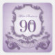 Design im Wappen-Stil in lila Farben mit großer 90. + "BIRTHDAY FEIERUNG" auf einem Band. Design auf quadratischem Aufkleber mit Namen. Sie können den Namen (Farbe, Schriftart, Größe und Position) einfach ändern, indem Sie auf die Schaltfläche Anpassen klicken. Erhältlich mit Design für 60., 70., 80., 95. Geburtstag. Entsprechende Geburtstagseinladung, Geburtstagsgeschenk Save the Date, Geburtstagskarte (Spiralheft), Vorgeschenkschachtel, Geschenktafel, Party (Papierserviette und Papiertüte), Kissen, Tasse und andere Geburtstagsgeschenke für Großmütter.