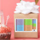 DIY Stifteaufkleber mit einem kleinen roten Marienkäfer auf einem Hintergrund in lila, blau, grün und orange - zum selber ausschneiden, für Kinder, mit Name personalisierbar.