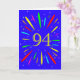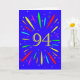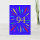 Eine explosive 94. Geburtstagskarte! Was für eine wunderbare Art, Geburtstagsgrüße zu schicken. Die Zahl 94 in hellgelb mit einer Explosion von hellen Farben und Sternen.