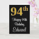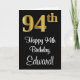 Dieses elegante, stilvolle und raffinierte Geburtstagskarten-Design bietet eine große Ordnungsnummer "94.", die ein goldenes Imitat/Nachahmung hat, zusätzlich zur Geburtstagsgrüßbotschaft "Happy 94. Geburtstag" und einem individuelle Name in einem Schriftart im Skriptstil. Der Hintergrund der Vorderseite ist schwarz. Die Innenseite hat eine personalisierte Geburtstagsgrüßbotschaft, oder könnte gelöscht und leer verlassen werden, wenn eine Nachricht von Hand geschrieben werden soll. Eine stilvolle Geburtstagskarte wie diese kann dazu verwendet werden, jemandes vierundneunzigsten Geburtstag zu feiern. [~Z0000518]