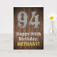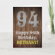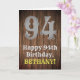 Dieses Landaussehen und Western inspiriert Geburtstag-Thema Grußkarte Design zeigt eine große rustikale inspiriert Zahl "94", die Nachricht "Happy 94. Geburtstag", einen bearbeitbaren Namen, und ein Imitat/Imitation Holz Getreide inspiriert Stil Muster Hintergrund. Die Innenseite hat eine personalisierte Geburtstagsgrüßbotschaft, oder könnte gelöscht und leer verlassen werden, wenn eine Nachricht von Hand geschrieben werden soll. Eine individuell anpassbare Geburtstagskarte wie diese könnte eine lustige Art sein, jemandem, der seinen vierundneunzigsten Geburtstag feiert, Geburtstagswünsche zu schicken. [~Z0000469]