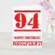 Dieses lustige Geburtstags-Thema Grußkarte Design verfügt über eine große rote Zahl "94" mit einer Gummi-Briefmarke inspiriert Aussehen, zusätzlich zu der Geburtstagsgrüße Nachricht "HAPPY BIRTHDAY", und einen personalisierbaren Namen auf der Vorderseite. Die Innenseite verfügt über eine individuell anpassbare Geburtstagsgrüßnachricht, oder könnte gelöscht und links werden, wenn eine Nachricht von Hand geschrieben werden soll. So eine lustige Geburtstagskarte, die an Sie angepasst werden kann, kann zum Feiern des vierundneunzigsten Geburtstags verschickt werden. [~Z0000524]