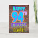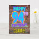 An der Vorderseite dieses lustigen Geburtstagskarten-Designs steht die Meldung "HAPPY 94 TH BIRTHDAY" mit einem farbenfrohen, lebendigen, graffiti-inspiriert Look, zusätzlich zu einem bearbeitbaren Empfängernamen. Der Hintergrund der Vorderseite weist ein inspiriertes Ziegelmauermuster auf. Die Innenseite hat eine individuelle Geburtstagsgrüßnachricht, oder könnte gelöscht und leer verlassen werden, wenn eine Nachricht von Hand geschrieben werden soll. Eine lustige, individuell anpassbare Geburtstagskarte wie diese könnte dazu verwendet werden, jemandes vierundneunzigsten Geburtstag zu feiern. [~Z0000531]
