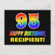 Die Vorderseite dieses fröhlichen, farbenfrohen und lustigen Geburtstags-Thema Postkartendesign zeigt eine große Zahl "95" und die Meldung "HAPPY BIRTHDAY", beide mit einem Regenbogenspektrum inspirierte Musterfärbung, zusammen mit einem kühnen gelben, anpassbaren Empfängernamen. Die Vorderseite hat auch einen minimalen schwarzen Hintergrund. Die Rückseite der Postkarte hat eine benutzerdefinierte Geburtstags-Grußmeldung, oder könnte gelöscht und leer verlassen werden, wenn eine Nachricht von Hand geschrieben werden soll. Eine fröhliche, anpassbare Geburtstagskarte wie diese könnte eine lustige Art sein, jemandes fünfundneunzigsten Geburtstag zu feiern. [~Z0000474]