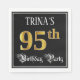 This fancy and luxurious birthday paper napkin design features a personalized name and the message “95th Birthday Party”. The large number “95th” has a faux/imitation gold-inspired coloring pattern, and the words “Birthday Party” are in elegant script-style text. The background is colored black by default (although it can be customized). Opulent, elegant paper napkins like this might be used at a birthday celebration being held to honor somebody’s 95th birthday. [~Z0000565]