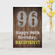 Dieses amerikanische Old West-Aussehen und das vom Land inspirierte Geburtstag Grußkartendesign mit einer großen rustikalen Look-Nummer "96", der Meldung "Happy 96. Geburtstag", einem bearbeitbaren Namen und einem Imitat/Imitation Holz Getreide inspiriert Look Muster Hintergrund. Die Innenseite verfügt über eine benutzerdefinierte Geburtstagsgrüßbotschaft oder könnte gelöscht und leer verlassen werden, wenn eine Nachricht von Hand geschrieben werden soll. Eine individuell anpassbare Geburtstagskarte wie diese könnte verwendet werden, um jemandes sechsundneunzigsten Geburtstag zu bestätigen. [~Z0000469]