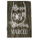 This luxurious and fancy birthday-themed giftbag design feature the message "Happy 96th Birthday" in ihrem Script Stil Text, wir haben falsches wood look pattern background. It feature a custom recipient name. A lavish birthday themed gift-bag like this might be used when giving a gift or present in celebration of somebody's 96th birthday. [~ Z0000558]