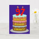 Dieses optimistische und lustige Geburtstagskarten-Design zeigt eine Darstellung eines dreistufigen Geburtstagskuchens mit numeralförmigen Kerzen oben, die die Zahl "97" anzeigt, sowie die Meldung "HAPPY 97 TH BIRTHDAY" und einen personalisierten Empfängernamen. Die Innenseite verfügt über eine individuell anpassbare Geburtstagsgrüßnachricht, oder könnte gelöscht und links werden, wenn eine Nachricht von Hand geschrieben werden soll. Eine fröhliche, personalisierte Geburtstagskarte wie diese kann zum Feiern des siebenundneunzigsten Geburtstages verschickt werden. [~Z0000620]