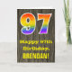 Die Vorderseite dieses bunten und dennoch rustikalen Geburtstags-Thema Grußkarte Design zeigt eine große Zahl "97" mit einem Regenbogenspektrum inspirierte Muster, zusammen mit der Meldung "Happy 97. Geburtstag", und einem benutzerdefinierten Empfänger-Namen. Der Hintergrund der Vorderseite der Karte zeigt ein rustikales Imitat Holzkorn inspirierte Muster. Im Inneren befindet sich eine individuell angepasste Geburtstagsgrüßbotschaft, oder man könnte sie löschen und leer verlassen werden, wenn eine Nachricht von Hand geschrieben werden soll. Eine individuell gestaltbare Geburtstagskarte wie diese könnte eine lustige Art sein, jemandes siebenundneunzigsten Geburtstag zu feiern. [~Z0000419]