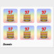 This upbeat and cheerful birthday themed square sticker design features a cartoon-style depiction of a three-tier birthday cake having numeral-shaped candles on top showing the number “97“, along with the message “HAPPY 97TH BIRTHDAY,”, and a custom recipient name. The background features a multicolored pastel rainbow spectrum inspired gradient pattern. Stickers like these might be used when celebrating somebody’s ninety seventh birthday. [~Z0000624]
