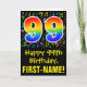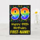 Die Vorderseite dieses lustigen, lebendigen und farbenfrohen Geburtstagskarten-Designs zeigt eine große Zahl "99" mit einem inspirierten Regenbogenspektrum-Gefälle, zusammen mit der Meldung "Happy 99. Geburtstag" und einem anpassbaren Empfängernamen. Die Vorderseite hat auch einen bunten Musiknoten und Symbolmuster. Im Inneren befindet sich eine individuell angepasste Geburtstagsgrüßbotschaft, oder man könnte sie löschen und leer verlassen werden, wenn eine Nachricht von Hand geschrieben werden soll. Eine personalisierte Geburtstagskarte wie diese könnte eine lustige Art sein, eine Botschaft zum Feiern des neunundneunzigsten Geburtstages von jemandem zu senden. [~Z0000420]