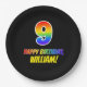 Dieses lustige, fröhliche und farbenfrohe Geburtstags-Thema Papier-Design zeigt eine große Zahl "9" und die Nachricht "GLÜCKLICH GEBURTSTAG", beide mit einem inspirierten Regenbogenspektrum-Farbverlauf, zusammen mit einem kühnen gelben personalisierten Namen. Es hat einen schwarzen Hintergrund. Spaß, personalisierte Geburtstagsthemen-Teller wie diese können bei Jemandem auf der 9. Geburtstagsfeier verwendet werden. [~Z0000488]