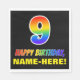 Dieses bunte, lustige und fröhliche Geburtstagsthema Papier Serviette Design zeigt eine große Zahl "9" und die Nachricht "GLÜCKLICH BIRTHDAY", beide mit einem Regenbogenspektrum inspirierte Musterfärbung, zusammen mit einem kühnen gelben editierbaren Empfängernamen. Der Hintergrund ist schwarz. Geburtstagskapier-Servietten wie diese können zum Feiern des 9. Geburtstages von jemandem verwendet werden. [~Z0000476]