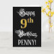An der Vorderseite dieses extravaganten und opulenten Geburtstags-Thema Grußkarten-Design steht die Meldung "Happy 9th Birthday", und ein benutzerdefinierbarer Empfängername. Ein Teil der Nachricht ist in einem ausgefeilten Text im Skriptstil enthalten. Die große Zahl "9th" weist ein Imitat/Imitation in goldinspiriert Optik-Muster auf. Der Hintergrund ist schwarz. Die Innenseite hat eine personalisierte Geburtstagsgrüßbotschaft, oder könnte gelöscht und leer verlassen werden, wenn eine Nachricht von Hand geschrieben werden soll. Eine elegante, maßgeschneiderte Geburtstagskarte wie diese könnte eine respektable Art sein, Geburtstagsgrüße an jemanden zu senden, der seinen neunten Geburtstag feiert. [~Z0000559]