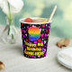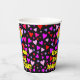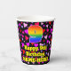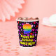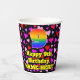 This happy and joyful birthday-themed paper cup design features a large number “9” with a rainbow spectrum gradient inspired pattern, along with the message “Happy 9th Birthday,”, and an editable name. The background features a pattern of pink, red, and purple heart shapes. Fun, upbeat paper cups like this might be fun to use at a birthday party/celebration being held in celebration of somebody’s ninth birthday. [~Z0000548]