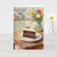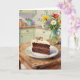A birthday card for her with a sweet illustration of a piece of chocolate cake, pretty colorful flowers sitting on a rustic wood table in a cute cottage kitchen.