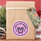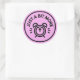 This image is a circular badge design set against a solid light pink background with a thick black border.