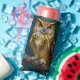 A beautiful personalized can cooler with a gold and blue owl sitting on a tree branch. This illustration has an impasto oil painting style.