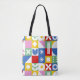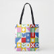 A colorful tote bag over their shoulder. The bag is the star of the scene — a bold patchwork-style design made up of bright geometric blocks, each featuring its own playful pattern.