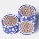 A casino chip features intricate floral patterns in pink, green, and purple on both sides, surrounded by a blue and white border, conveying elegance.