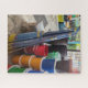 A challenging though relaxing puzzle with many colors with lots of depth showing Stacks of Colorful buckets with the longest sparklers leaning beside them on a sunny tienda in Guatemala