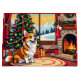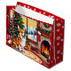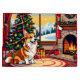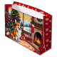 An adorable Christmas gift bag with a festive Corgi sitting in front of the fireplace on a cold winter day. A Christmas tree decorated and a festive background.
