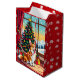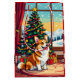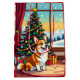 An adorable Christmas gift bag with a festive Corgi sitting in front of the fireplace on a cold winter day. A Christmas tree decorated and a festive background.