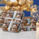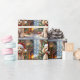 An adorable Christmas gift wrap with a festive poodle sitting in front of the fireplace on a cold winter day. A Christmas tree decorated and a festive background.