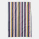 A decorative fabric features horizontal and vertical patterns with alternating stripes in blue, yellow, and white, accented by zigzag maroon lines. The design is clean and symmetrical, conveying a modern and vibrant feel.