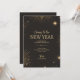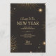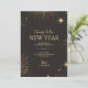A festive New Year's invitation card featuring gold fireworks on a black background. Text reads "Cheers to the New Year" with event details below.