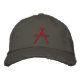 Worn Look hat mit Scharlach A auf der Vorderseite und Atheist bestickt auf der rechten Rückseite des Hutes.