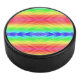 A hockey puck with a vibrant, symmetrical rainbow