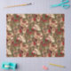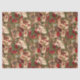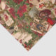 This tissue paper features a dense, vintage-style Christmas collage dominated by a rich palette of reds, greens, and creams. The background is a thick jumble of holly and bright red poinsettias, overlaid with various Victorian-era Christmas postcard images. Key motifs include several depictions of Santa Claus with a white beard, children in historical winter clothing, snow scenes with churches and village houses, and smaller images of birds and snowmen. The overall aesthetic is one of old-fashioned festive abundance, blending traditional Christmas greenery with nostalgic holiday illustrations.
