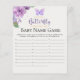 Carta de juego con el nombre del bebé, con una Hermosa Tematica de Mariposas y flores en acuarela en tonos Rosas y Purpuras. con linda tipografia dorada con la frase " A LITTLE BUTTERFLY IS ON THE WAY" un fondo amarillo claro es ideal para recibir a esa dulce niña que viene en camino, Juego perfecto para jugar durante el baby shower. Se pide a los invitados que escriban los nombres de los bebés que comienzan con cada alfabeto. ¡Quien termine todos los alfabetos primero gana!