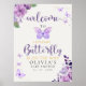 Bienvenido a su evento con este cartel de bienvenida de personalizable para baby shower. con este hermoso diseño con Tematica de Mariposas y flores en acuarela en tonos Rosas y Purpuras. con linda tipografia dorada con la frase " A LITTLE BUTTERFLY IS ON THE WAY" un fondo amarillo claro es ideal para recibir a esa dulce niña que viene en camino!. Personaliza este elegante y sencillo cartel de bienvenida para Baby shower agregando sus propios detalles.