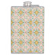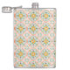 A metal flask with a colorful, symmetrical pattern of floral motifs in blue, orange, and yellow on a pale pink background, conveying a vintage, playful tone.