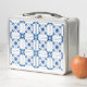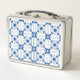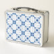 A metal lunchbox featuring a blue and white geometric tile pattern is shown in two views, front and back. The design is intricate, evoking a classic style.