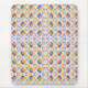 A mouse pad with a colorful geometric mosaic design featuring repeating patterns in blue, orange, and red tones. A white mouse is placed nearby.