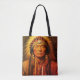 A Native American Chief, in full Indian dress, is on the front and back of this trendy, white tote bag, with a black strap.