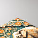 Two elephants stand side by side, their trunks intertwined, in front of a stylized tree with orange flowers. The elephants are decorated with similar floral patterns in shades of orange and gold. The background is a mosaic of blue tiles, with an archway above the elephants also adorned with orange flowers and foliage.