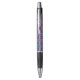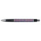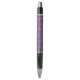 A pen with a colorful geometric pattern on the barrel; black grip and clicker on both ends. The tone is vibrant and modern, shown in front and bottom views.