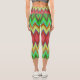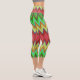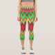 A person is wearing vibrant, geometric-patterned capri leggings