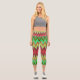 A person is wearing vibrant, geometric-patterned leggings in reds, greens, and yellows, paired with a gray crop top and white sneakers, standing casually.