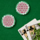 A poker chip with a floral pattern in pink and green with geometric accents on both sides, creating a vibrant and playful design.