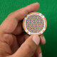 A poker chip with an intricate floral pattern featuring pink, purple, and orange flowers and green leaves on both sides, bordered with orange and white segments.