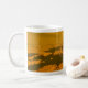Eine imaginäre und originelle 3D-Darstellung einer Landschaft auf der Oberfläche von Titan der größte Mond des Saturns. Die attraktive, hauchgelbe Landschaft und Meere von flüssigem Methan. Möglicherweise kein ideales Urlaubs-/Urlaubsziel, aber in Bezug auf die Kudos würde alles auf der Erde schlagen. In der Tasse steht "A Present from Titan"