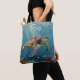 A sea turtle themed personalized tote bag with an illustration of a sea turtle under a calm teal sea swimming among the coral on the ocean floor with sun rays beaming down on him through the aqua water.