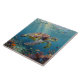 A sea turtle themed tile with an illustration of a sea turtle under a calm teal sea swimming among the coral on the ocean floor with sun rays beaming down on him through the aqua water. Add a coastal feeling to your beach home by adding this to your backsplash!