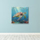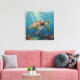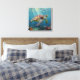 A sea turtle themed wall art with an illustration of a sea turtle under a calm teal sea swimming among the coral on the ocean floor with sun rays beaming down on him through the aqua water.